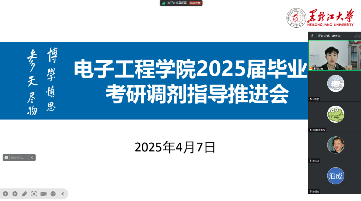 为深入贯彻落实教育部关于高校毕业生就业工作部署,系统推进公司2025届毕业生高质量升学工作,切实提升考研调剂成功率,2025年4月7日,3377体育依托腾讯会议平台线上召开2025届毕业生考研调剂指导推进会,公司2025届毕业生辅导员谢洪宝、张亮、于仪以及有调剂需求的同学共同参加本次会议。