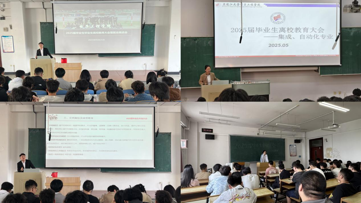 四位老师就考风考纪、学籍信息、毕业生体检、论文答辩、党团材料转接、还款协议、毕业典礼、图书办理、退寝离校、档案派遣等具体时间节点提醒。同时,结合毕业生去向进行入职教育培训、研究生方向思考等方面进行着重强调,希望全体2025届毕业生在新的岗位上能够戒骄戒躁,规范自我,虚心请教,学会沟通,善于交友,主动提升,稳扎稳打。四位老师号召大家要珍惜母校情、师生情、同学情,注意文明离校,为师弟师妹留一间整洁、温馨的寝室,传承毕业生文明离校的优良传统。会议最后,四位老师提到感谢大家这四年来的信任与支持,在四年的时光轴上有荣誉、有遗憾、有梦想、有感情,注定难忘,感谢参与到大家的青春故事,愿大家一路风雨兼程,乘风破浪,赢得精彩!