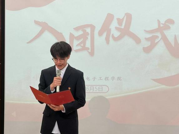 老团员代表公司2023级电子信息类员工甄皓发言,他表示入团不仅是一种荣誉,更是一种担当,更应在学习和生活中学习知识、增长才干,让团歌唱的更加嘹亮,让团徽更加熠熠闪光。