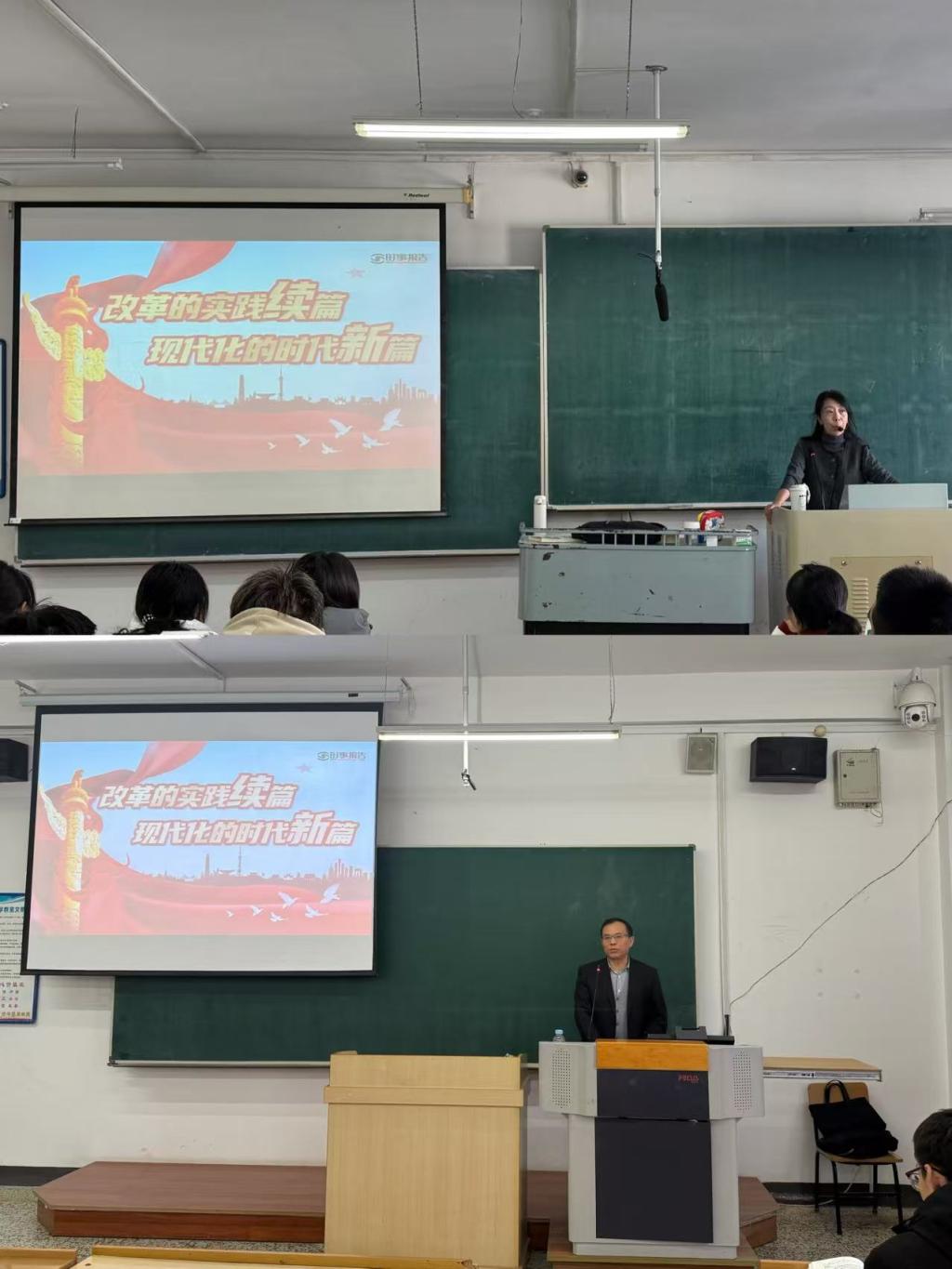 两位老师首先介绍了党的二十届三中全会召开的重要作用和重大意义,指出这次会议充分肯定了新时代以来全面深化改革的成功实践和伟大成就,在新征程上要继续高高举起改革开放伟大旗帜,坚定不移走中国式现代化道路,具有继往开来的里程碑意义。中国式现代化是在改革开放中不断推进的,也必将在改革开放中开辟广阔前景。课堂上,两位老师从“把握历史主动 改革波澜壮阔”“锚定关键领域 擘画改革蓝图”“遵循改革规律 保持战略定力”三个方面展开系统讲授。他们讲到,无论从改革广度和深度看,还是从党和国家各项事业发展对改革的实际检验看,全面深化改革都是一场思想理论的深刻变革、一场改革组织方式的深刻变革、一场国家制度和治理体系的深刻变革、一场人民广泛参与的深刻变革。未来5年是以中国式现代化全面推进强国建设、民族复兴伟业的关键时期,我们面临的形势环境之复杂前所未有,肩负的改革发展任务之艰巨前所未有,开创中国式现代化建设新局面,仍然要靠改革开放。