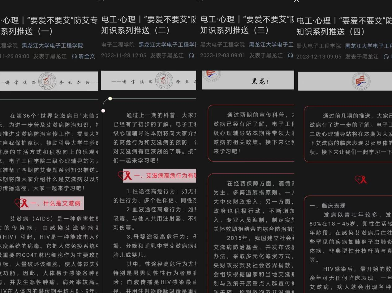 为进一步普及艾滋病防治知识,持续推进艾滋病防治宣传工作,公司二级心理辅导站发布了四期防艾专题系列知识推送,分别为“什么是艾滋病以及它的传播途径”、“引发艾滋病的高危行为和预防”、“艾滋病的临床表现”以及“艾滋病防治”的相关政策。