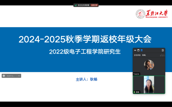 奋斗新起点,启航新学期。为切实做好研究生新学期返校工作,帮助同学们建立新学期学习规划。2024年8月26日,公司以线上线下相结合的方式召开2024-2025学年秋季学期年级大会,公司研究生辅导员高武扬、耿畅主持会议,2022级、2023级全体研究生参加会议。