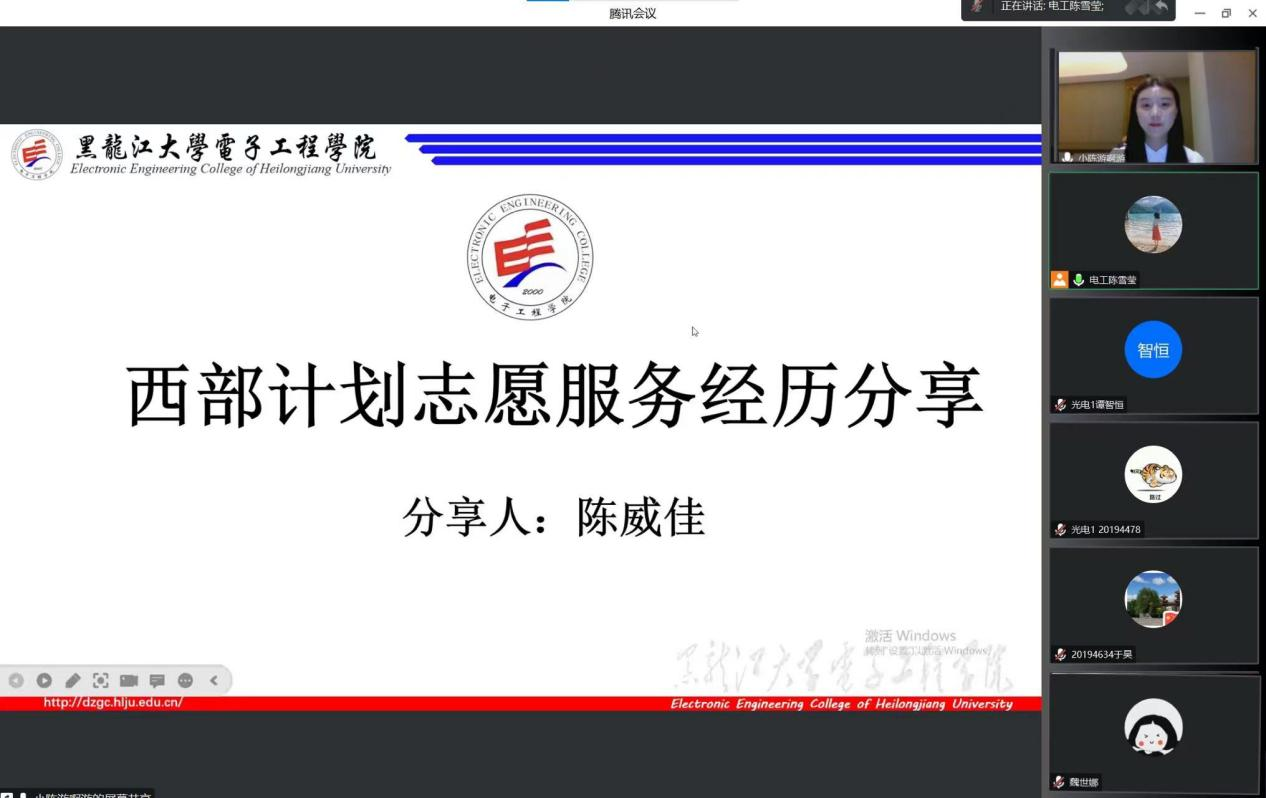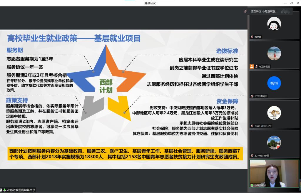 陈雪莹针对西部计划的概念向同学们做出解释。老员工志愿服务西部计划是经国务院常务会议决定,由共青团中央、教育部、财政部、人力资源社会保障部共同组织实施的一项重大人才工程。项目自2003年实施以来,已累计招募了41万余名高校毕业生和在读研究生。陈雪莹着重对该项目报名流程、报名条件、社会保障、相关待遇等方面的情况进行详细的解读,让同学们有了更加深入的了解与认识。随后,2021届西部计划志愿者陈威佳向同学们分享她为期一年的志愿服务经历,阐述了西部计划的优点,详细解答了同学们比较关注的问题,鼓励同学们深入基层,积极投身志愿服务。