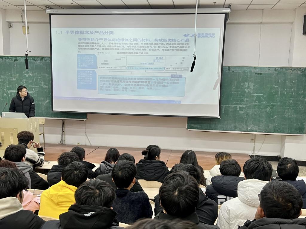 随后,王野分别从半导体概念及产品分类、中国集成电路行业现状、芯片制作流程等方面进行讲解,使同学们更加深入地了解了专业的发展,提高了同学们的专业认知与职业认知水平。