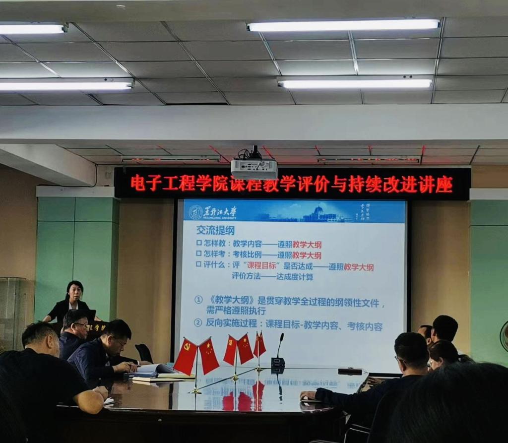 会议第三项:通信工程负责人王尔馥老师讲解《新版教学大纲下“教、考、评 一体化”的课程教学评价与持续改进》。王尔馥老师以通信专业必修课《通信原理》为例,通过从课程目标出发,根据课程目标安排教学内容、设计考核环节,根据考核环节拆分分值比例,达成度计算等方面进行讲解。王老师强调,定性定量结合、针对课程目标达成度进行有针对性的持续改进才能支撑专业毕业要求的有效达成。