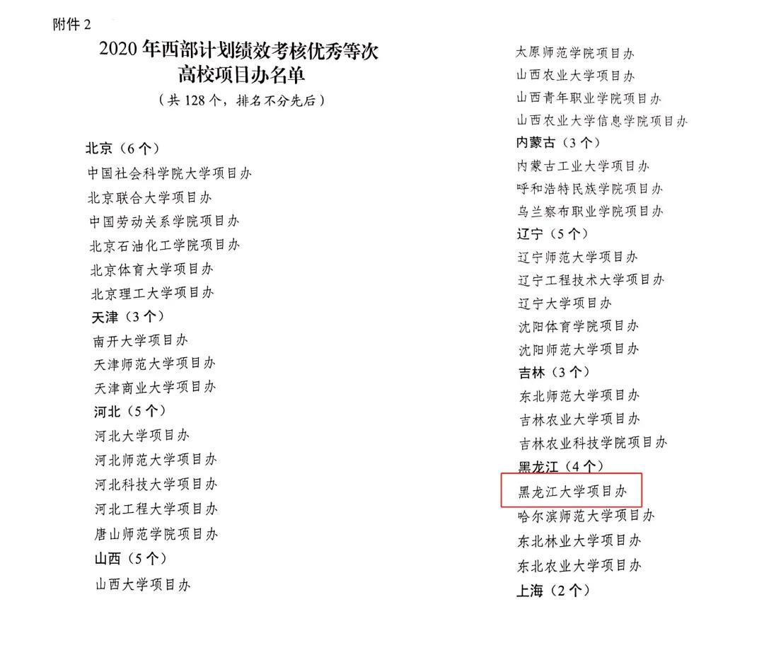 近日,全国老员工志愿服务西部计划项目管理办公室公布了2020年西部计划绩效考核优秀等次高校项目办名单,公司项目办荣获2020年西部计划绩效考核优秀等次高校项目办。全国共有128所高校获评“优秀项目办”,黑龙江省仅有四所高校获评该项荣誉。