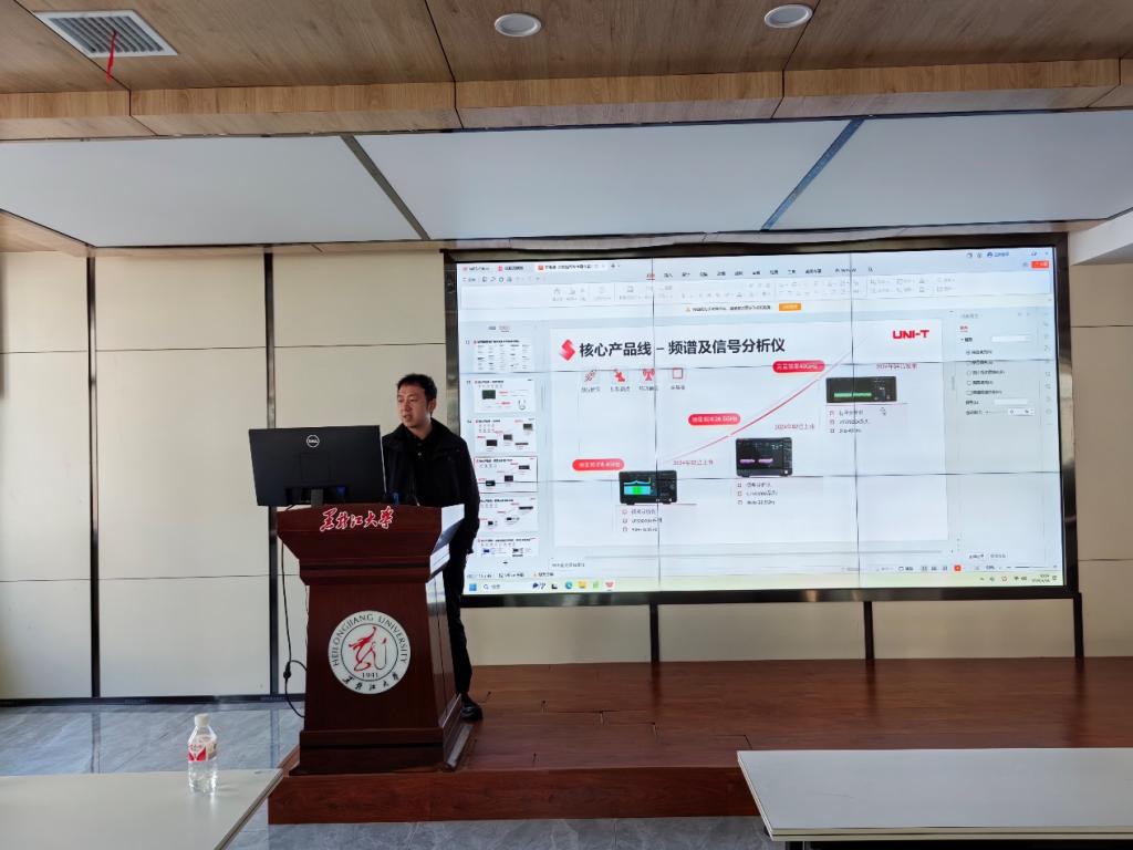 单汝熠向在场的师生详尽地阐述了企业在技术储备、核心产品线、奖项设置以及技术开发方法和思路等方面的相关情况。并为参会师生就研电赛优利德应用型数字信号发生器企业命题相关内容做了介绍。